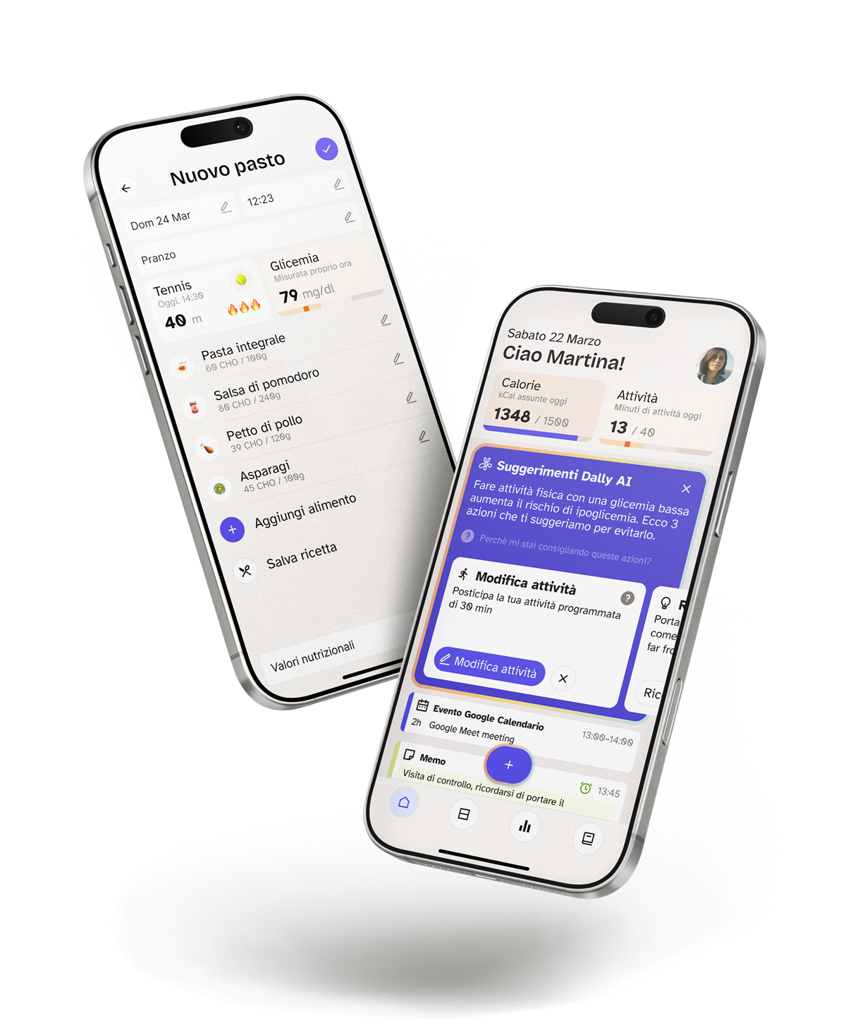 Con Dally hai tutto in un’unica app: conta dei carboidrati, diario glicemico, promemoria farmaci, attività fisica e tanto altro. In più, grazie all’AI, ricevi consigli personalizzati e contenuti educativi utili per conoscere meglio il tuo corpo e migliorare la tua salute ogni giorno.